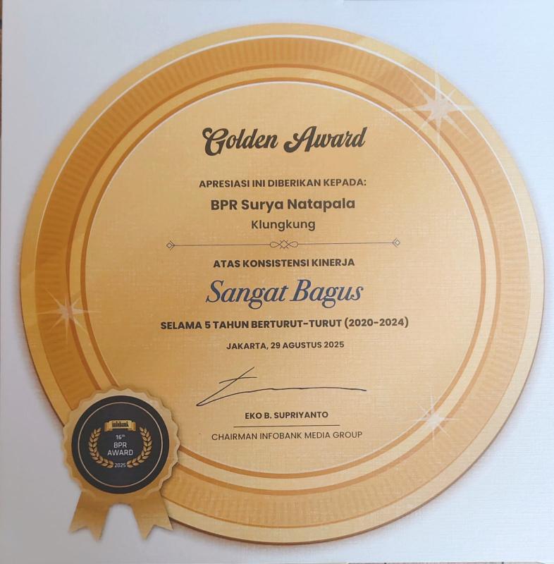 Bank BPR Surya Natapala meraih Penghargaan Golden Award Sebagai Bank dengan Kinerja Keuangan Sangat Bagus Selama 5 Tahun Berturut-Turut (2020-2024) oleh Infobank.