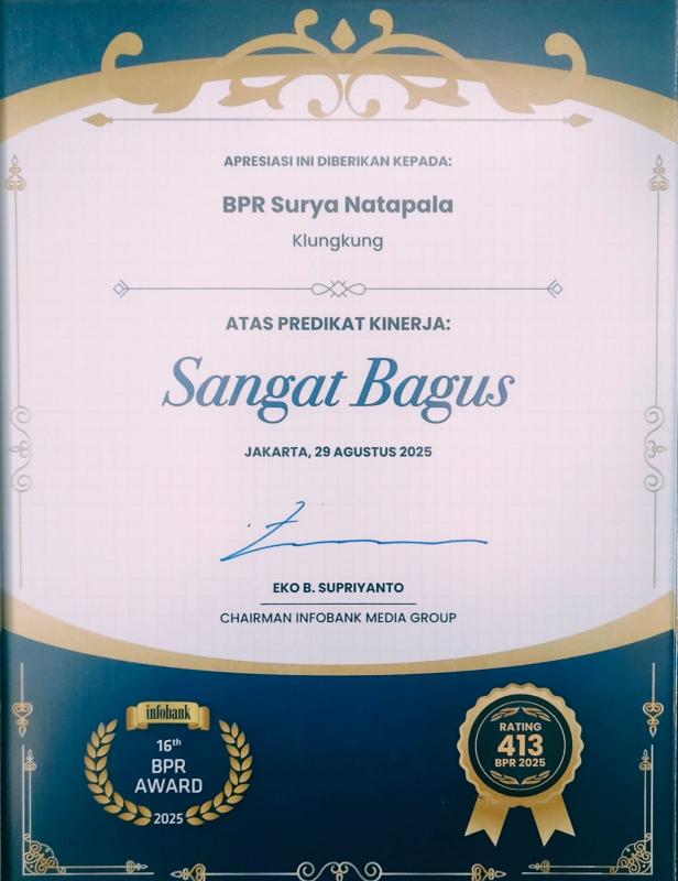 Bank BPR Surya Natapala meraih Penghargaan Sebagai Bank dengan Kinerja Keuangan Sangat Bagus Tahun 2025 oleh Infobank.